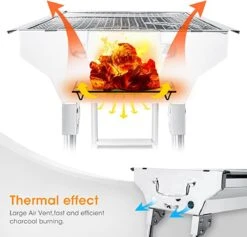 De barbecue wordt geleverd met eenvoudig te volgen instructies voor stressvrije montage zonder gereedschap, gewoon openen en vier poten neerzetten en inklappen en hij is klaar om na gebruik aan het handvat te worden bevestigd. Met ventilatieopeningen aan beide uiteinden van de grill, zodat de luchtstroom gemakkelijk kan worden geregeld en de warmte gelijkmatig over de grill wordt verdeeld. Gemakkelijk te gebruiken en schoon te maken.